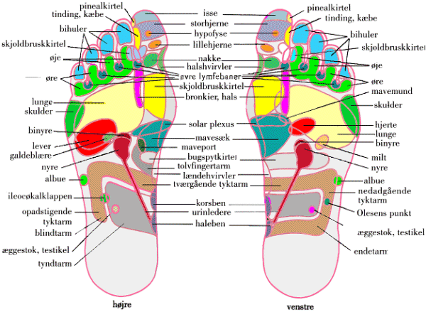 På fødderne findes et fuldstændigt kort over hele menneskekroppen. Hver del af kroppen har en zone på fødderne, som kaldes en reflekszone. Hvis der er ømhed i en reflekszone, hænger det sammen med at nerveender fra alle af kroppens organer findes på fodsålerne. Omkring disse nerveender kan der dannes krystaller, og det kan belaste hele kroppen. Imidlertid kan zoneterapi på reflekspunkterne fjerne aflejringerne i vævet, og kroppens balance kan dermed genoprettes.